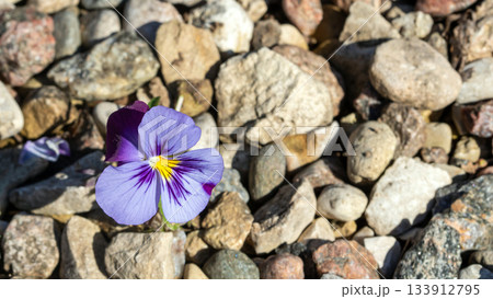 A solitary blue flower blooming resiliently through stony ground