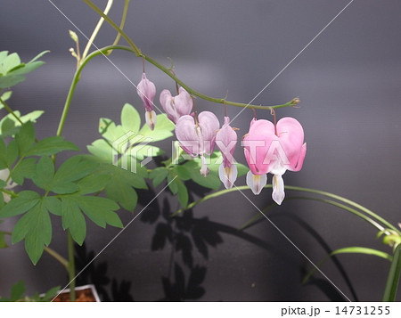 珍しい形の花・釣竿に数匹の鯛がかかったようなタイツリソウ=ケマンソウの花蕾・ピンクバック横位置
