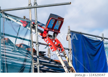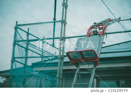 住宅イメージ 新築中の木造住宅に屋根瓦を上げる瓦上げ機