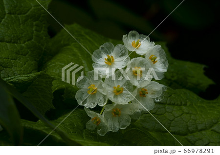 雨に濡れて透明になったサンカヨウ