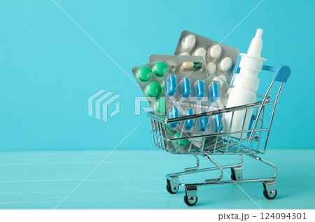 Shopping cart loaded with pills on blue background. The concept of medicine and the sale of drugs. Copy space.
