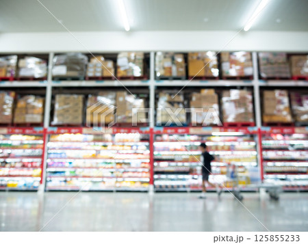 Blurred view of modern supermarket store background. aisle shelves in hypermarket superstore defocused bokeh light background.