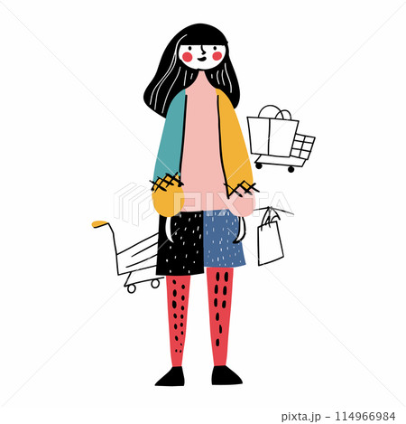 Young woman shopping bags fashion modern style. Happy shopper girl colorful outfit trendy accessories. Stylish female consumer purchases shopping cart