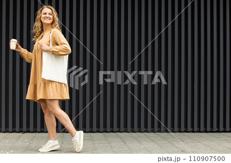 A girl in a summer outfit with a reusable shopping bag.