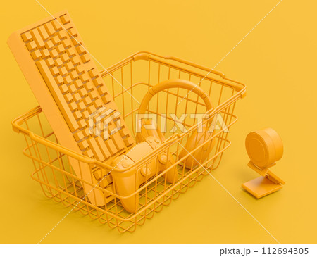 Gamer gears like mouse, keyboard, joystick, headset, VR Headset in basket on monochrome background. 3d render concept of sale, discount, shopping and delivery of accessories for live streaming