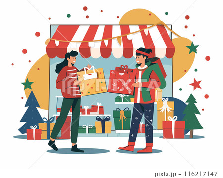 Two women shopping for Christmas gifts at an outdoor market, surrounded by holiday decorations and presents.