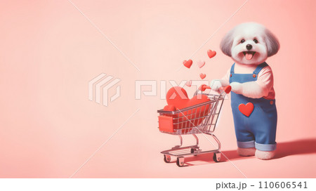 Cute funny dog holding a Shopping cart with heart inside. Valentines day concept