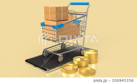 3d Parcel box in shopping basket. delivery and online shopping advertising concept. icon isolated on white background. 3d rendering illustration. Clipping path.