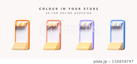 3d Set of color store on phone for shopping online concept. icon isolated on white background. 3d rendering illustration. Clipping path.