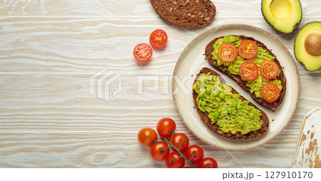 Healthy breakfast with avocado, tomatoes and peas on rye bread top view on white wooden background