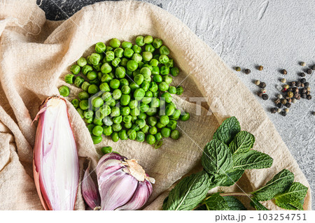 organic mushy peas ingredients peas mint shallot pepper and salt keto food photo over grey stone background and cloth top view close up