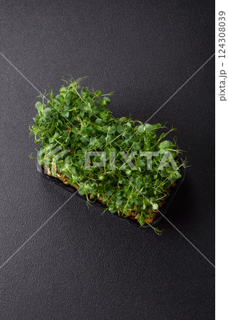 Young fresh green pea microgreen sprouts in plastic box