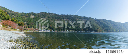 滋賀県長浜市西浅井町 菅浦湖岸集落の民家と紅葉の山並み