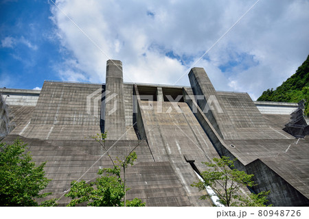 展望台の機能も有する神戸市北区の石井ダムを下部より見上げる 縦位置
