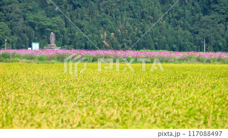 美しい水と緑に恵まれた 自然王国の稲作風景 背景コスモス畑風景 (菊池市旭志)伊坂区彼岸花の里