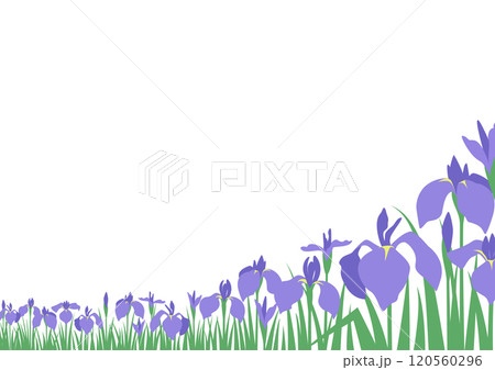 紫色の花菖蒲、あやめがたくさん咲いている風景のベクターイラスト A4 横