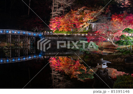 静岡県伊豆市修善寺 虹の郷 紅葉のライトアップ リフレクション