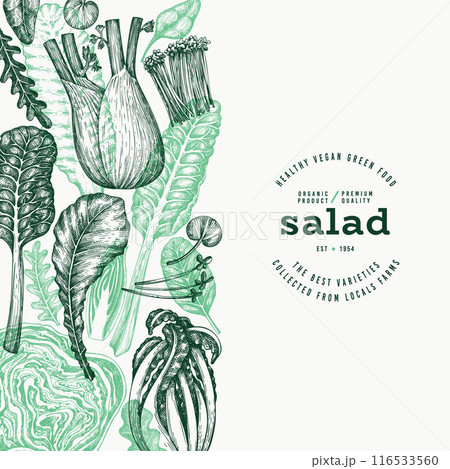 Green Vegetable Design Template. Vector Hand Drawn Healthy Leaf Salad Banner. Vintage Style Menu Illustration.