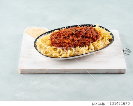 Tagliatelle with vegan tomato bolognese ragu with soya protein granules