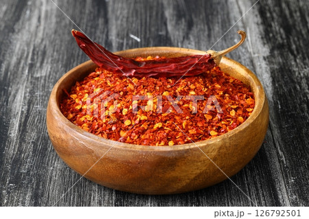 Wooden bowl with crushed chili pepper and fresh red chili pepper on old table. Selective focus.