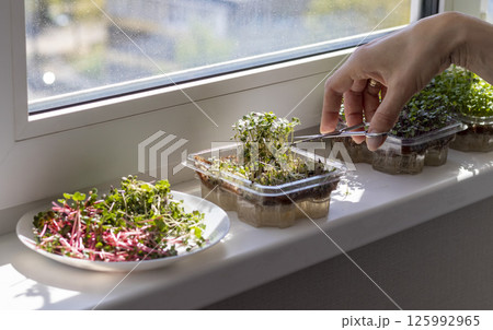 Urban microgreen farm. Eco-friendly small business. Baby leaves, phytolamp.