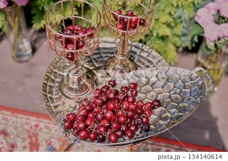 Cherries in large golden dishes Chic serving of dishes. Fruit