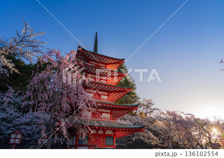 【春素材】朝の新倉山浅間公園の忠霊塔と桜【山梨県】