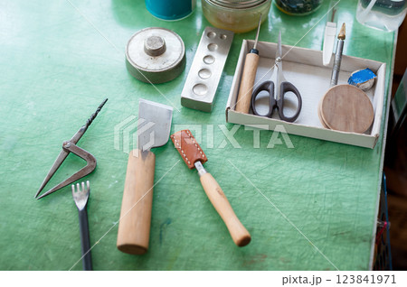 レザークラフトの道具と茶色の革 革細工