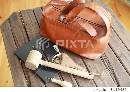 レザークラフトの道具と茶色のレザーバッグ 革細工