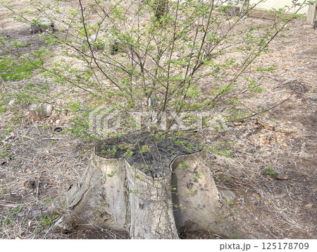 ナラ枯れによって伐採されたコナラの切株とひこばえ