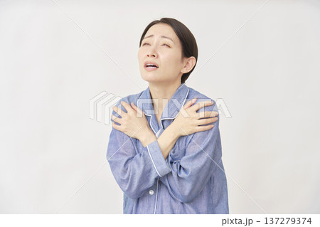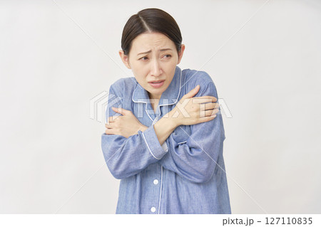 パジャマを着た女性 冷え性 白バック