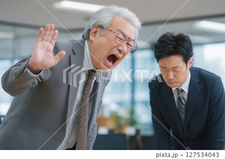 パワハラ。手を上げ怒る上司と謝罪する若い男性部下の会社内トラブル
