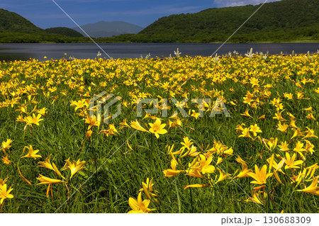 福島県喜多方市熊倉町雄国 雄国沼湿原の満開のニッコウキスゲと背景の西吾妻山などの景色