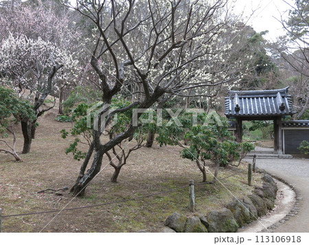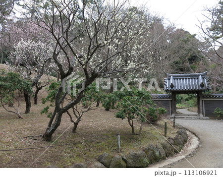 緑萼梅などの梅が咲く横浜市の三溪園(海岸門付近の中国梅林)