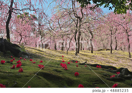 京都市伏見区城南宮の梅と落ち椿を撮影