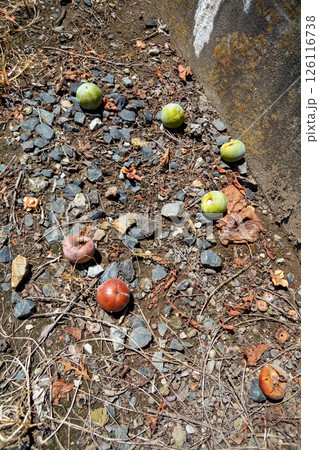 地面に落ちた柿イメージ|熊除けに落とした柿イメージ|自然環境イメージ
