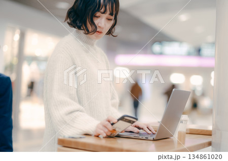 Woman in sweater sits on brown sofa, intently focused on laptop with decorated Christmas tree in background, small table with red mug and phone is next to her