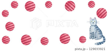 Gray tabby cat, border of red striped balls on a white background. Horizontal watercolor banner. Playful charming layout perfect for children parties, announcements, pet-themed content, blog headers