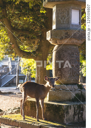 Portrait of young sacred sika deer beside mossy stone lantern in Nara Park