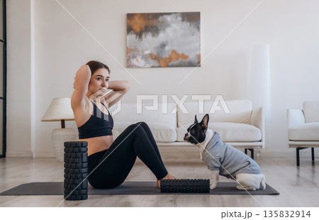 Woman with pug dog is doing yoga at home