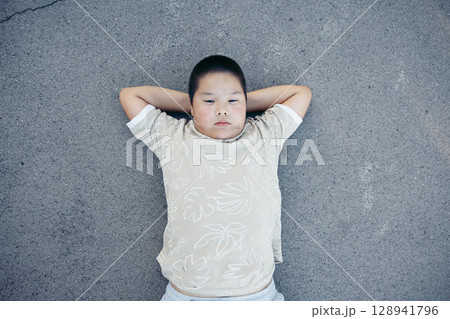 Daydreaming under the sky Calm child, Asian teen boy stares upward lying on ground
