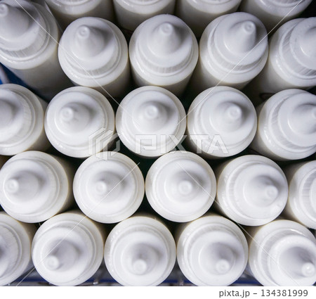 Close-up texture of grouped white plastic dropper containers for pharmaceuticals, cosmetics, or laboratory use. Top view
