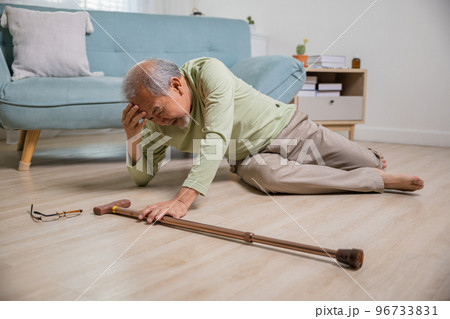 Older senior man headache lying on the floor after falling down he pain and hurt from osteoporosis, Elderly man falling on the floor alone with walking stick at home, Health care and medicine