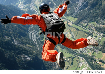 Adventurous Skydiver in Mid Freefall with Arms Spread Wide Against Scenic Backdrop