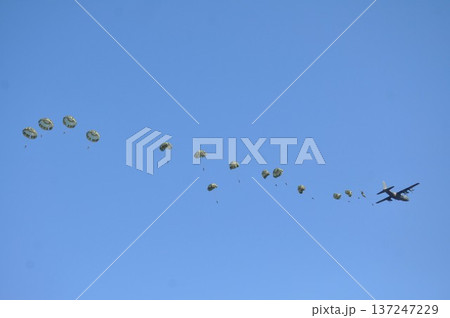 軍用機から落下傘で降下する隊員