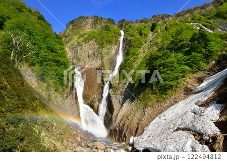 日本一落差の称名滝と幻のハンノキ滝 青空と雪渓と虹のコラボレーション