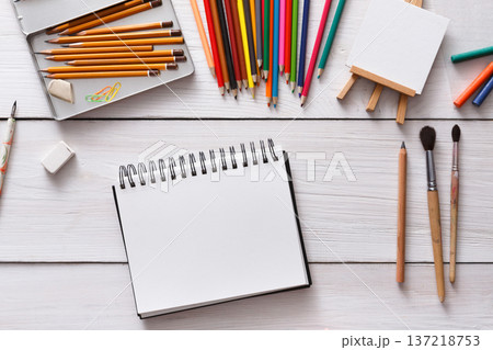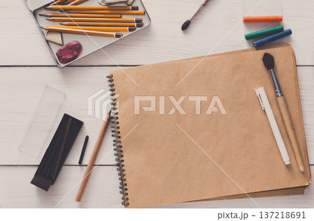 Draw in sketchbook. Creative artist workspace top view. Background of painting, art stationery