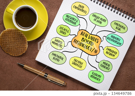 Real values in human life remain beyond the easy reach of technology or AI. Infographics mind map.