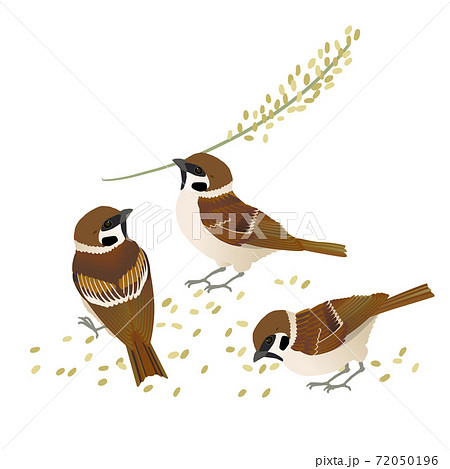 稲穂を足で持って飛ぶスズメのベクターイラストカット