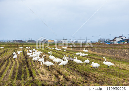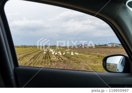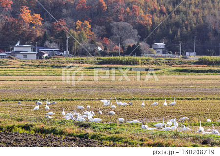 北海道むかわ町、稲刈り後の田んぼで落穂拾いをする白鳥の群れ【10月】